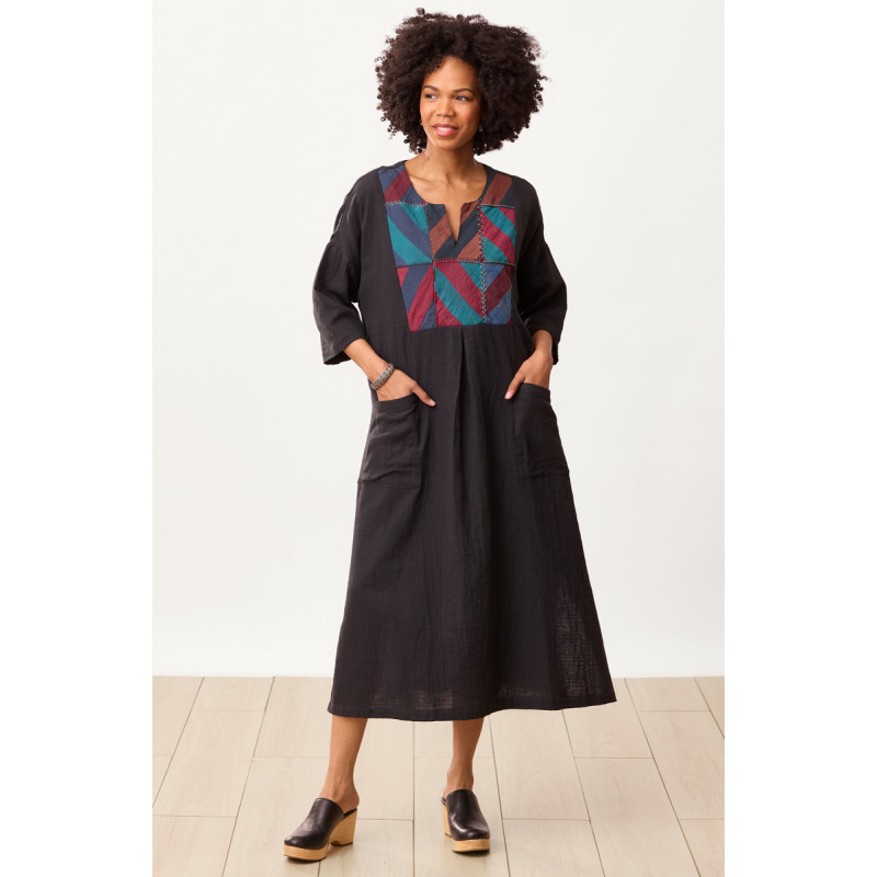 Stylish and comfy double gauze kaftan dress with an embroidered chindi patchwork yoke in a classic quilt design. The colorful yoke has a front pleat for a great sweep. Dropped shoulders with three-quarter length sleeves. Deep side slits for an easy sweep. Back ties let you adjust to your preferred fit. Generously cut - consider sizing down for less oversized look.