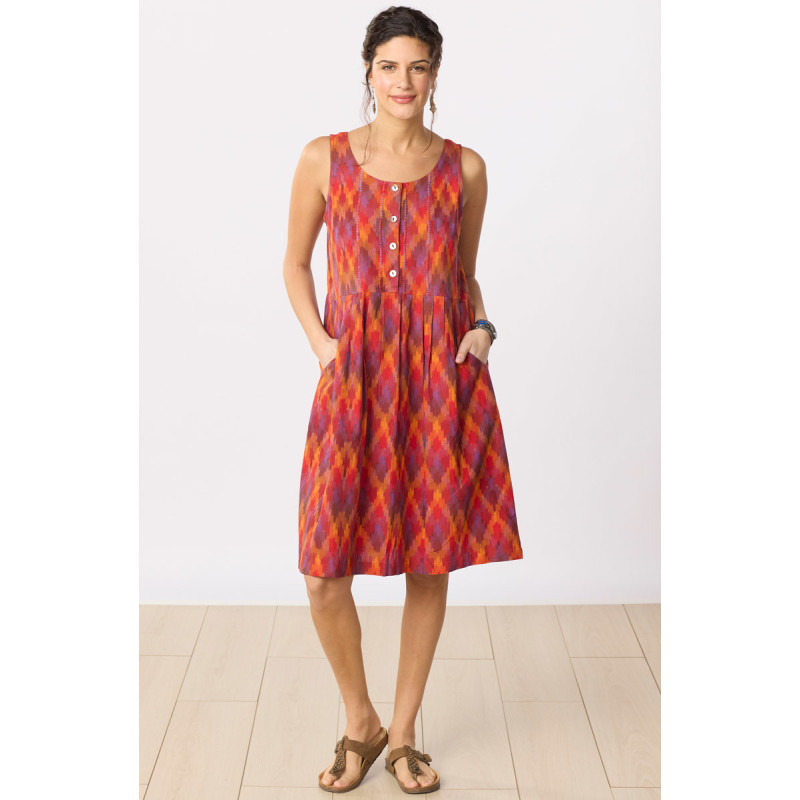 Summer colors, summer style. Sleeveless A-line ikat dress with a gently pleated skirt is woven in fiery reds, oranges and purples. Button placket is highlighted with hand embroidery.