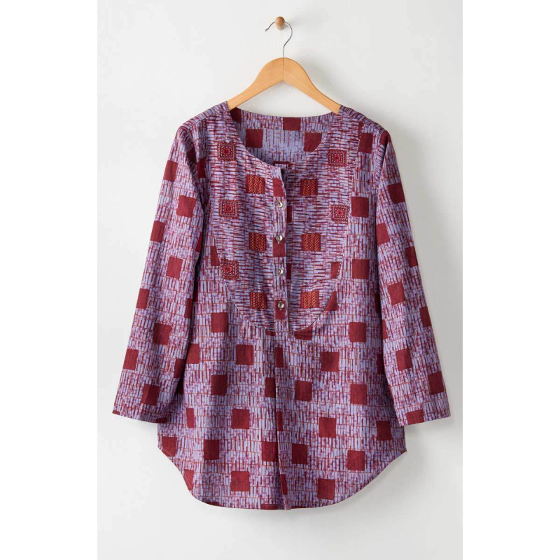 Scoop neck light blue top blockprinted in red and orange is our go-everywhere tunic. The curved button yoke with a center pleat has hand embroidery accents and seam detail. Shirttail hem.