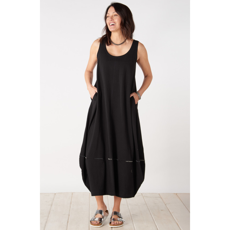 A new silhouette for a basic black jersey dress: a long tank dress with a lantern-shaped hem. Hem seam has hand embroidery accents. Perfect to pair with your favorite top or jacket.