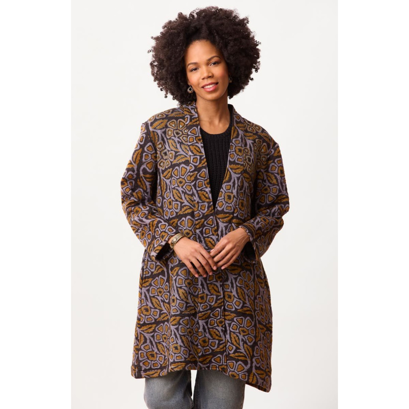 Soft and cozy, this quilted A-line long jacket can work as lightweight outerwear. No closure, with a lapel that widens towards the hem, ready to overlap on a cool day. Blue and dark gold batik block print on black quilted knit. Coordinating hand embroidery on the print design.