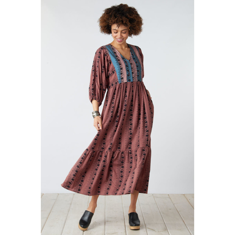 This lightweight peasant-style dress is ready for every occasion. Warm brown cotton is blockprinted in black, with a contrasting teal and latte brown hand embroidered yoke. The V-neck has a single button back closure, and the gently gathered skirt ends in a generous flounce which will make you want to twirl. Three-quarter length dolman sleeves with elastic. Back ties let you adjust to your preferred fit.