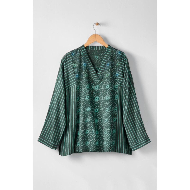 V-neck kurta-style top in two shades of blue-green has coordinating handprinted front and back panels paired with blockprinted stripes. Hand embroidery accents the shoulder print design. Side slits. Shorter version of our standard kurta. Generously cut - consider sizing down for a less oversized look.