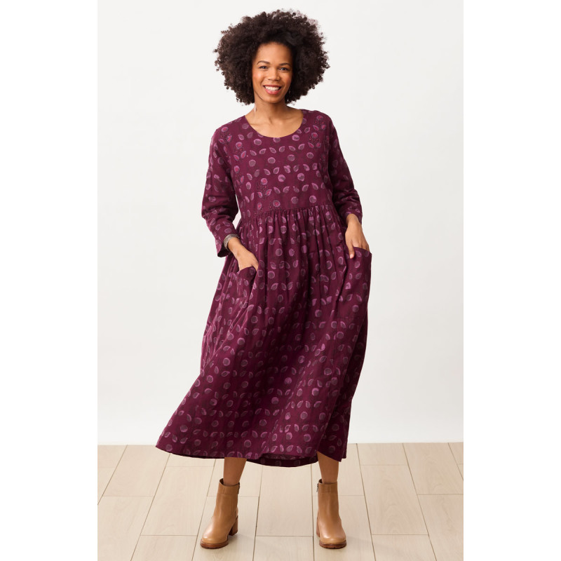Easy-on and ready to go, this scoop-neck long dress is batik block printed in dark purple with light purple and green accents. The gently gathered skirt has an easy sweep. Hand embroidered florals embellish the bodice. Dropped shoulders and three-quarter-length sleeves. Generously sized, with back tab ties to let you adjust to your preferred fit.