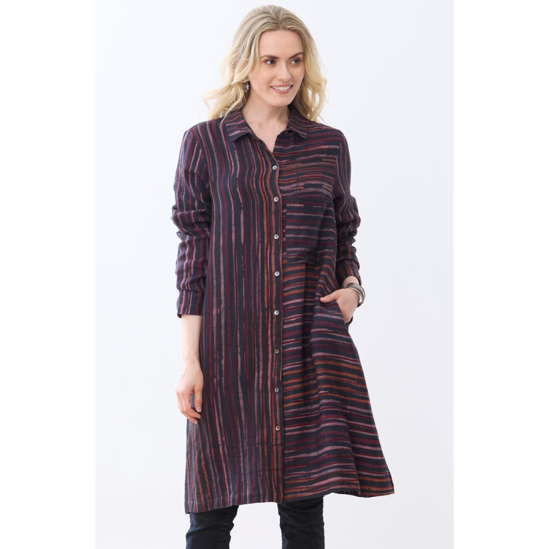 Directional block prints in black, dark red, and other autumn colors define this long shirt in textured cotton crepe. Hand embroidery embellishments.The versatile top also works as a dress or topper. Handkerchief hem, roll-tab sleeves.